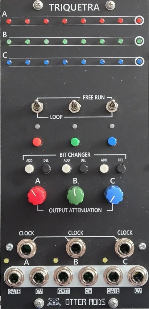 Triquetra is a flexible shift-register module that allows the user to choose individual loops, output levels, gate settings, and bit-generating algorithms for each of the three registers for a powerful source of modulation and sequencing in your rack.